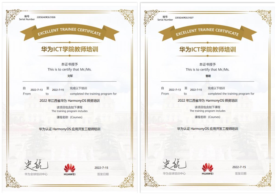 為拓寬教師教學視野,加深對華為HarmonyOS的認識和了解,推進軟件工程專業教學改革,7月13日-15日,我院選派軟件工程專業教師劉軍、曹璐參加由華為技術有限公司在新余舉辦的HarmonyOS師資培訓。